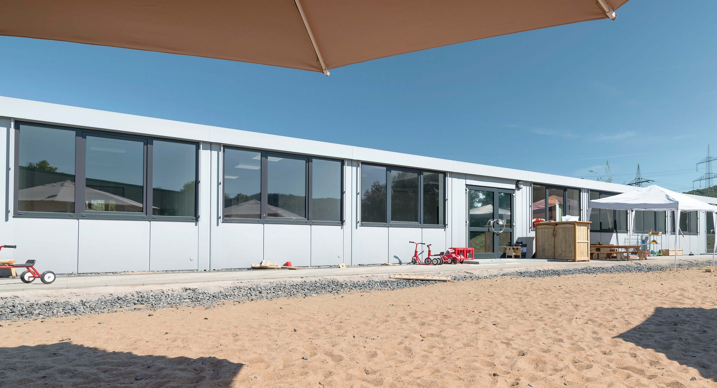 Die vorläufigen Räumlichkeiten wurden im Gewerbegebiet Altebach innerhalb von nur wenigen Wochen realisiert. Dort können rund 50 Kinder in drei Gruppen betreut werden. Die Leistungen umfassten nicht nur die Aufstellung und Montage der Kita-Container, sondern bereits beim Bauantrag und bei der Gründung sowie bei der Ausarbeitung und Umsetzung des Brandschutzkonzepts konnte sich der Bauherr auf KLEUSBERG verlassen.